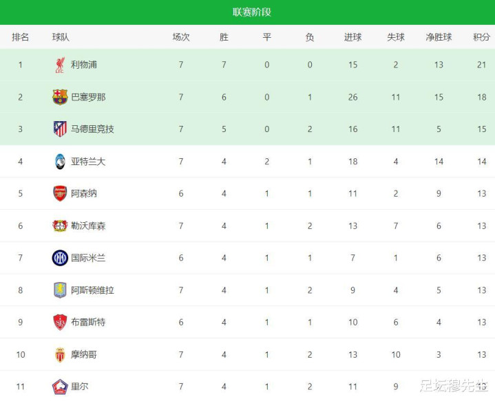 未雨绸缪很重要。那些拿到13个积分但排在阿斯顿维拉后面的球队,你猜他们为啥?不就是净胜球不够吗?打不过强队也就罢了,但遇到弱队,没把握好机会,刷足数据,那就怪不得别人了。所以,7轮过后,对欧冠新赛制理解最深刻的球队,诞生了。